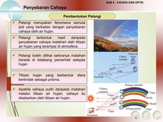 Ringkasan bab 8 merangkumi81 Penggunaan Cermin82 Sifat Cahaya83 Pantulan Cahaya84 Pembiasan Cahaya 85 Penyebaran Cahaya86 Penyerakan Cahaya 87.